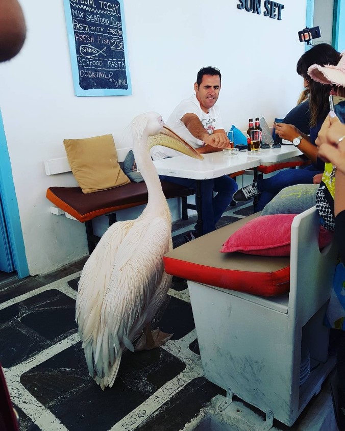 거대한 펠리컨. 식당에서 키우는건지 모르겠지만. 한 그리스인이 날개도 잡아서 펴주고 입도 별려줍니다. 입벌릴때는 깜놀했네요.