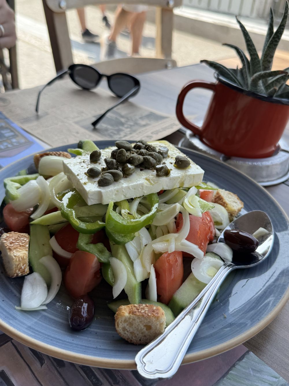첫끼에 먹은 음식인 그릭샐러드는 신선한 올리브 오일과 올리브, 토마토, 짭쪼름한 페타치즈를 버무려 간단하면서도 깊은 맛을 냈습니다. 아직도 떠오르는 여름의 맛이라 집에서도 계속 해먹을 예정입니다 :)